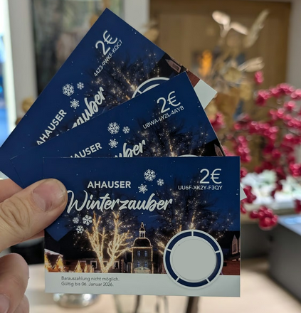 Der Einzelhandel in Ahaus verteilt ab dem 7. November 2025 Ahauser-Winterzauber-Gutscheine im Wert von 2 €. Diese können ab dem 21. November 2025 auf dem Oldenkottplatz bzw. Sümmermannplatz eingelöst werden. Ob für Getränke, Essen, Karussellfahren oder Schlittschuhverleih – diese tolle Aktion des Gewerbevereins Ahaus bietet für jeden etwas.